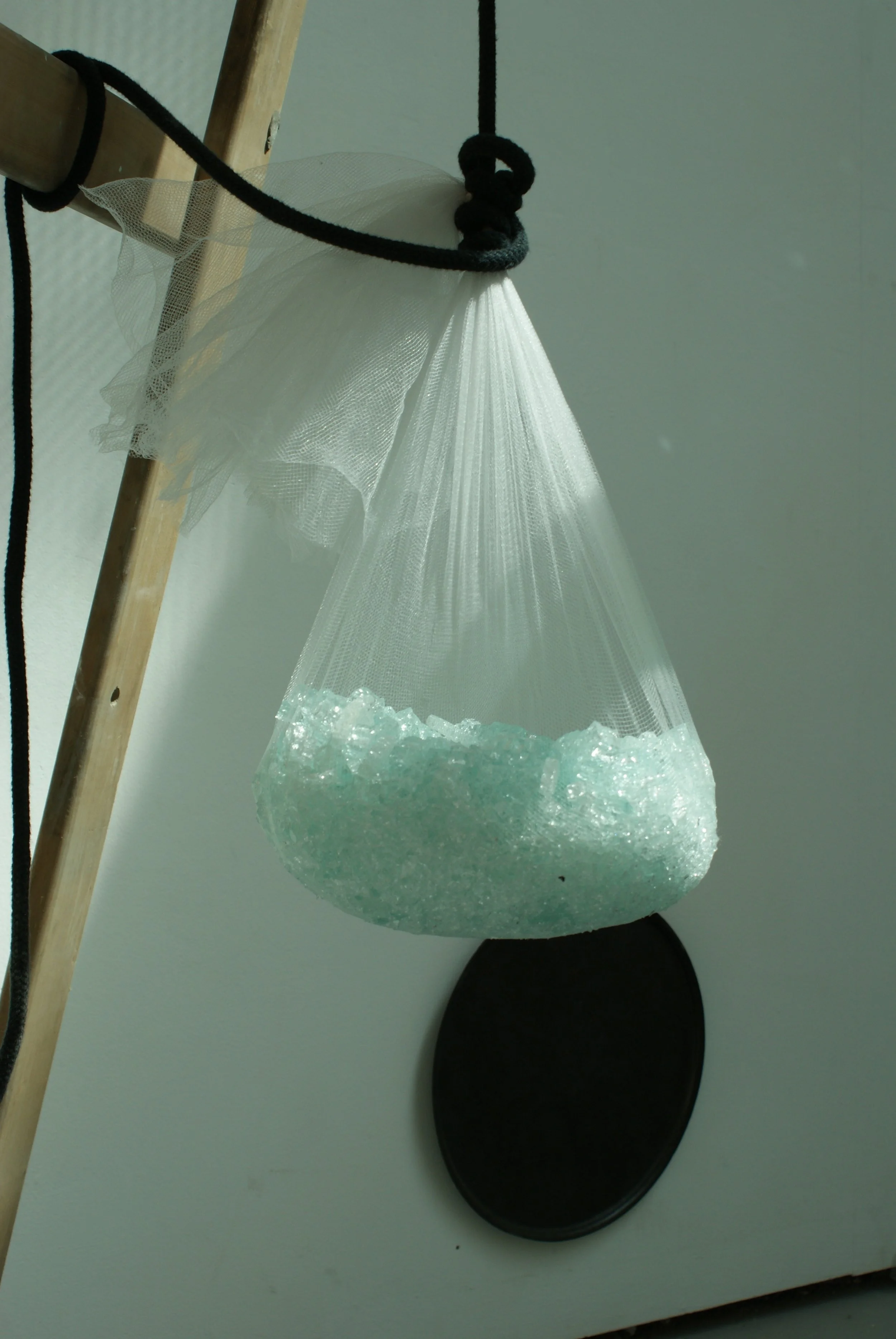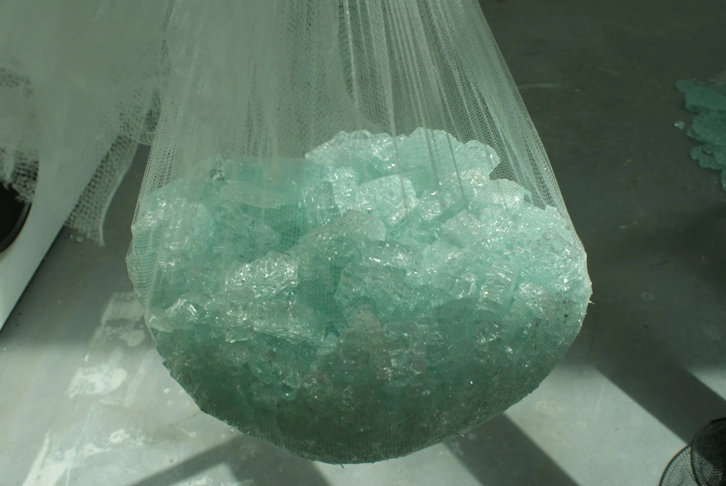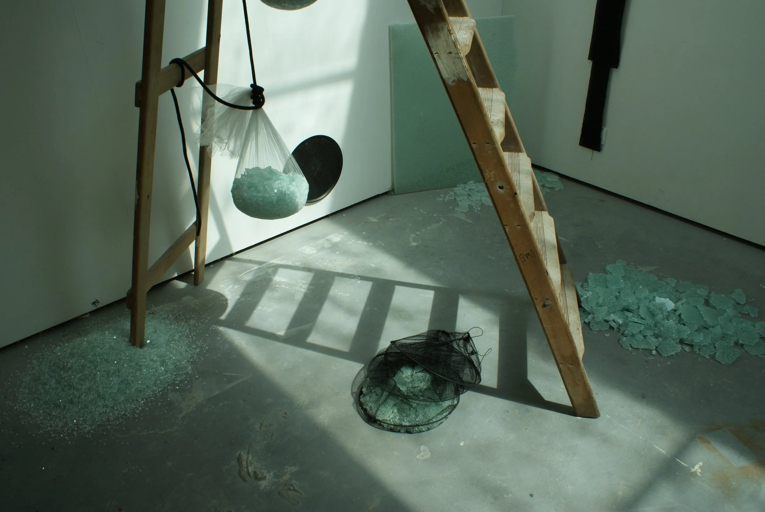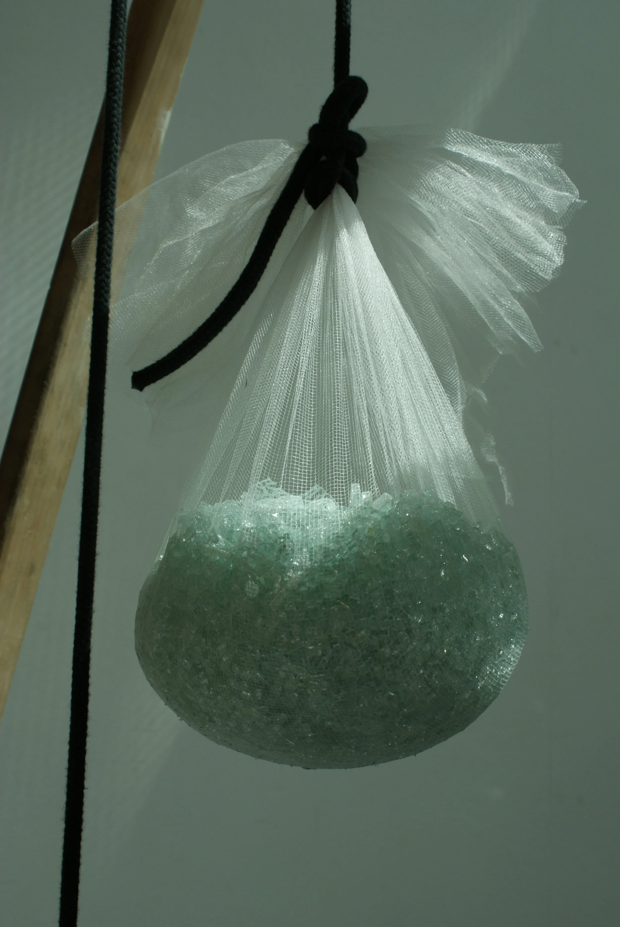 Laminated glass, fabric, polystyrene, wood, nylon mesh, rope