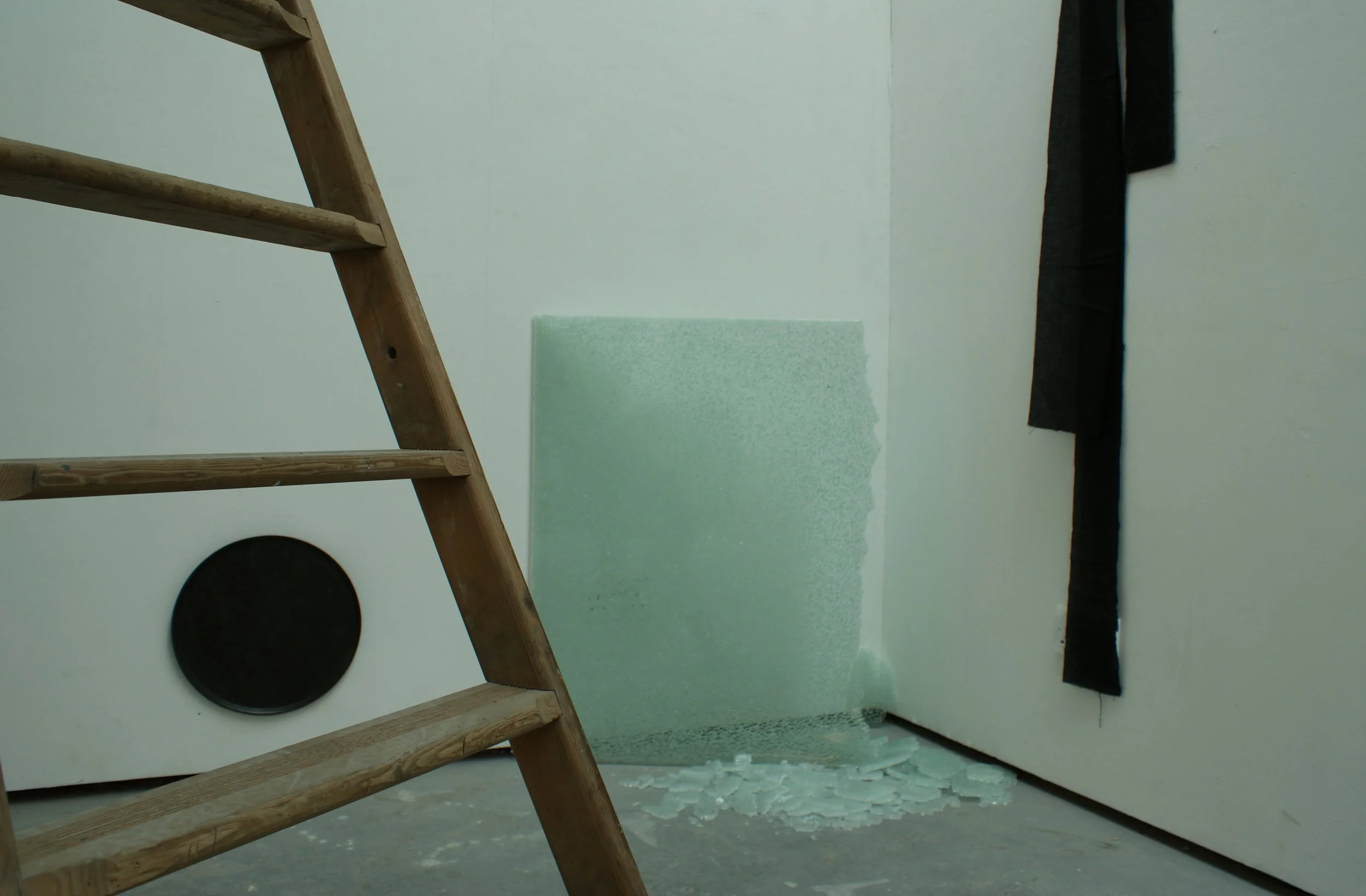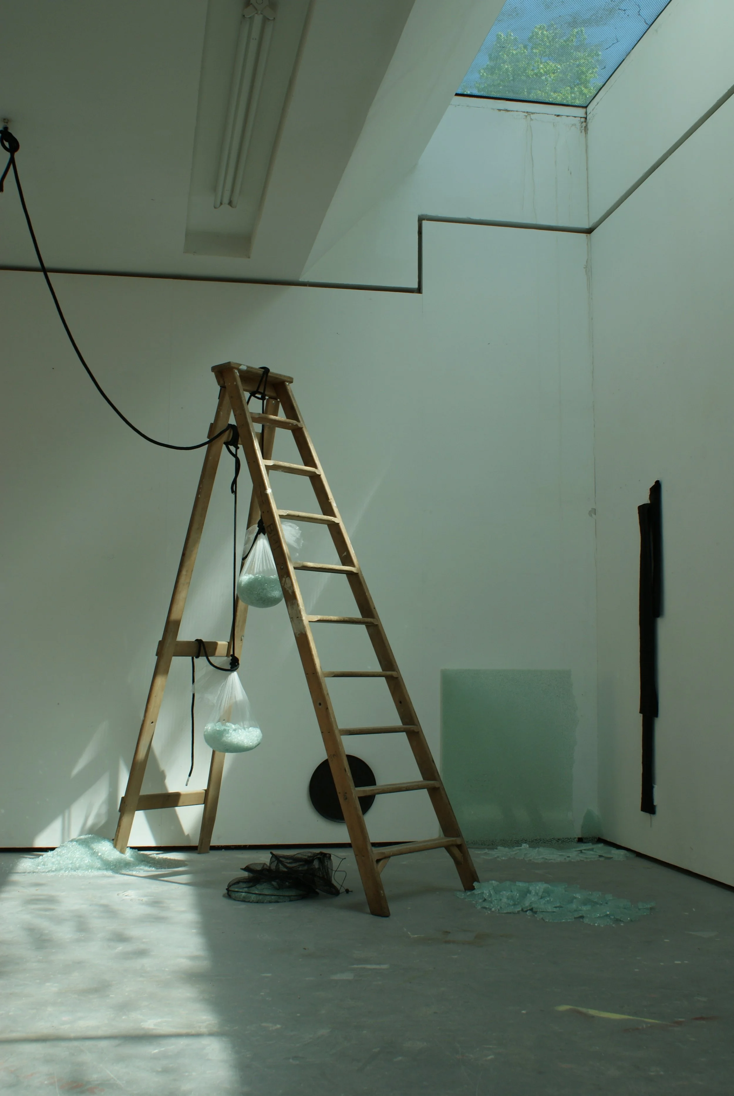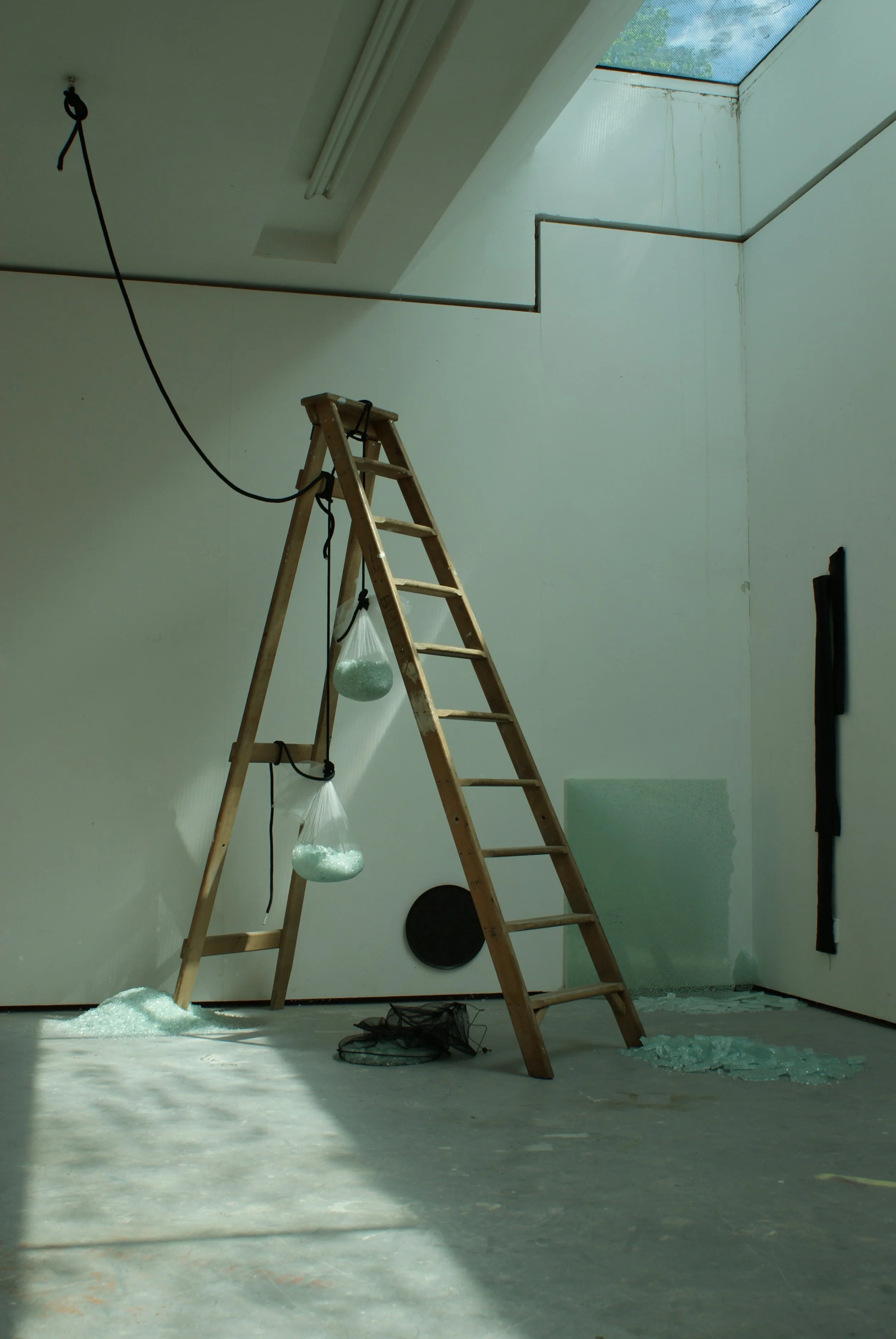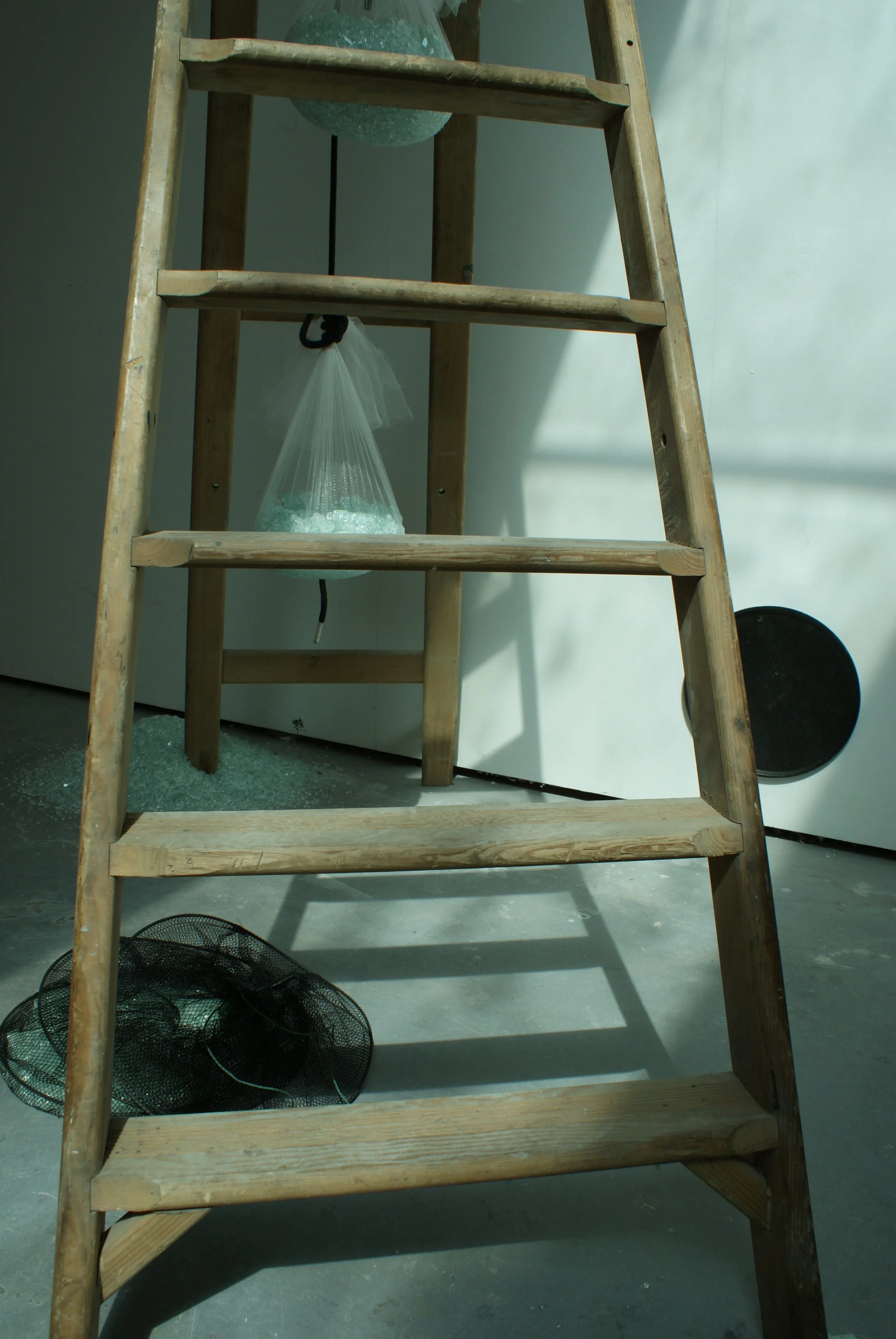 Laminated glass, fabric, polystyrene, wood, nylon mesh, rope