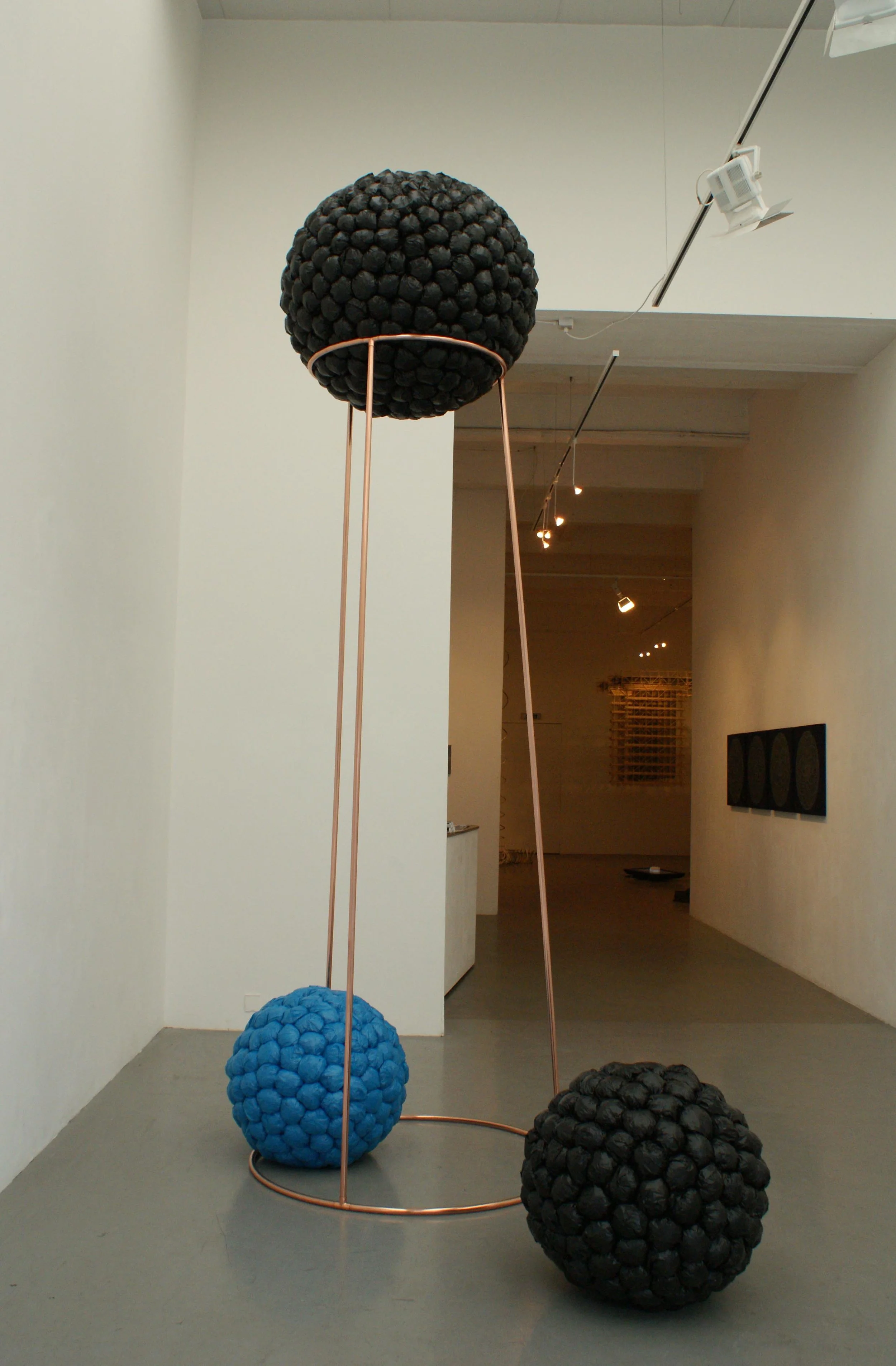 STRANGE FRUIT - Installation View, APT Gallery, London. Copper, paper spheres, plastic bags, glue and wire. Dimensions: Main structure + sphere 375 x 100 x 100 cm. Floor spheres - 75 x75cm